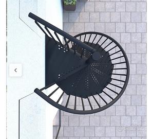 Vendo scala a chiocciola a base tonda modello Zeta Iris,larghezza 160 cm, struttura in acciaio galvanizzato acciaio, gradini in acciaio galvanizzato grigio. 14 gradini invece di 13. Usata per pochi mesi in cantiere. Ritiro al domicilio