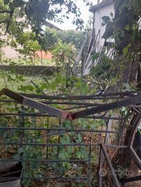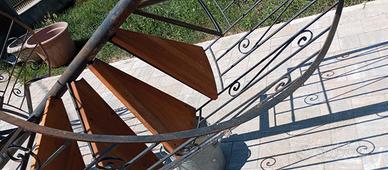 Scala a chiocciola in ferro con gradini in legno. Diametro 160 , altezza all'ultimo gradino 275. Mancorrente danneggiato al primo gradino (vedi foto) eventualmente riparabile o accorciabile.