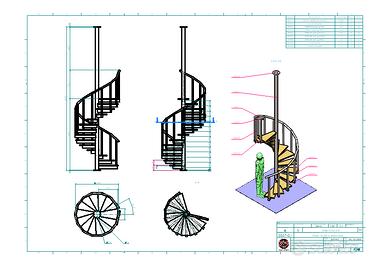 Realizzo progetti tecnici per scale a chiocciola: modelli 3D, disegni esecutivi e tutta la documentazione necessaria (PDF / DWG / DXF / STEP), pronta per essere consegnata a qualsiasi officina metalmeccanica.