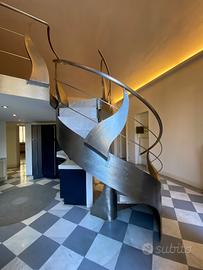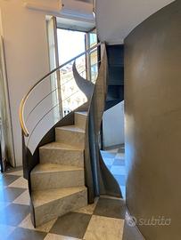 Scala a chiocciola di design Bonansea, ferro e marmo, altezza 236 cm, fornita completa di ringhiere e parapetto.