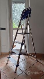 Scala in alluminio marca COLOMBO versione 4 gradini con rifiniture blu. La scala è un po' usata ma tenuta bene, funziona perfettamente, è solida e molto comoda
