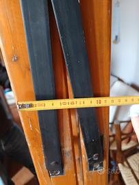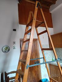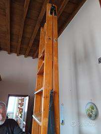 Scala realizzata su misura per soffitti alti, in legno e ferro battuto. 9 alzate e un ripiano di appoggio. Altezza ripiano di appoggio 220 cm. Chiusa ha ingombro minimo come in foto. Solo ritiro centro storico.