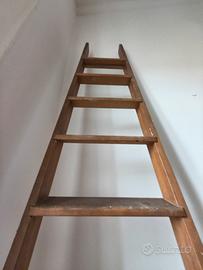 Scala in legno alta a restringersi. Misure: H: 300 cm, L base 60 cm, L testa 30 cm. Ritiro in Milano città. € 65