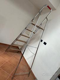 Scala pieghevole avente struttura in metallo e 5 gradini in legno; gradini che hanno una profondità di cm 9. Larghezza base cm 54. Massima apertura dei montanti a pavimento cm 113. Altezza da chiusa cm 202. Bologna zona Ospedale Maggiore. Euro 38,00