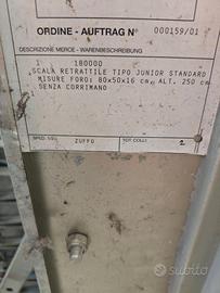 Vendesi scala retrattile professionale marchio Estfeller, leader italiano assoluto nel settore. Modello Junior standard, specifico per fori botola di dimensioni ridotte, ideale per chi ha poco spazio ma non vuole rinunciare alla massima sicurezza e stabilità. Caratteristiche Tecniche: Misure Foro Botola: 80 x 50 cm Spessore Solaio: 16 cm Altezza Massima: 250 cm (pavimento-soffitto) Materiale: Struttura a pantografo in lega leggera di alluminio ad alta resistenza. Usata ma ben conservata ed integra al 100%, perfettamente funzionante in ogni sua parte (molle, snodi e sistema di chiusura). A differenza delle scale economiche da brico, la Estfeller Junior garantisce una portata elevata, estrema facilità di apertura/chiusura e una durata nel tempo senza paragoni. È la soluzione perfetta per accedere a soffitte, sottotetti o soppalchi con fori stretti (soli 50 cm di larghezza). CONSEGNA A MANO, NO SPEDIZIONE