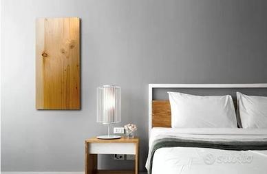 Corpo scaldante in ceramica 15mm, rivestito con pannello in legno di cedro 50mm, supporto a muro in acciaio verniciato.