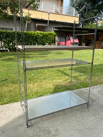 Vendo scansia in ferro con 3 ripiani. 1 in legno e 2 in vetro satinato Dimensioni 110x79x40 Ritiro a mano
