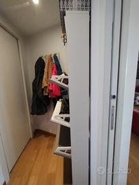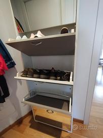 vendo scarpiera a cinque ripiani di cui tre con specchio. colore laterale Bianco a poro aperto, due ripiani legno a poro aperto color tortora. in buone condizioni generali. svendo per lavori di ristrutturazione casa. misure: - lunghezza 182 cm - profondità 18 cm - larghezza 67 cm ogni ripiano è di 35 cm e tiene 3 paia di scarpe . ritiro a Milano in zona metropolitana Zara.