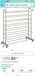 scarpiera a carrello fatta a ripiani...presenti 9 ripiani..telaio in acciao e sbarre color nero ferro opaco ...dietro ha una x come rinforzo per non farla dondolare...sono presenti le ruote 360gradi incluse di blocchi di fermo/freno..