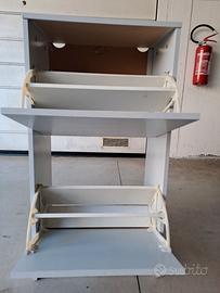 Vendo per inutilizzo scarpiera Ikea Bissa. È ridipinta in grigio come da foto. Presenta qualche difetto: manca di 3 perni di blocco (vedi foto), credo facilmente recuperabili e ha qualche segno sulla superficie. Vendo a 15€