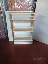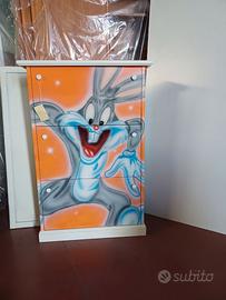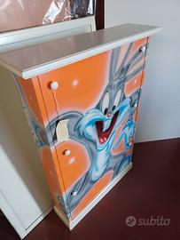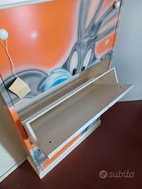 Scarpiera 3 ribalte in pioppo massello. Dipinto completamente a mano con l'uso del pennello e dell'aerografo. I colori sono atossici a base d'acqua.