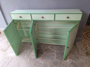Scarpiera in legno massello verniciato di costruzione artigianale. Può essere montata a parete o appoggiata a pavimento. E' dotata di tre cassetti e tre ante. Dimensioni lunghezza 135cm, profondità 26cm, altezza 80cm.
