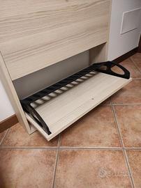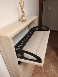 Scarpiera a 3 ante effetto rovere. Usata ma tenuta molto bene. Misure: 72x15x110 cm