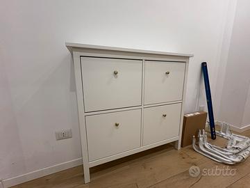Scarpiera Hemnes ikea con un anno di vita tenuta molto bene in ottimo stato. Unico difetto piccolo nell’angolo a destra in alto. In dotazione pomelli cromati oro come in foto.