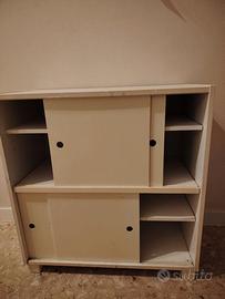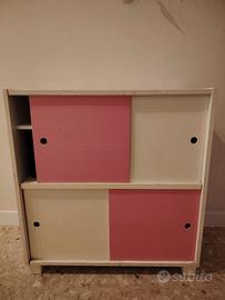 4 ante scorrevoli e scambiabili bianco/rosa, due ripiani spostabili. Misure 72x68x34