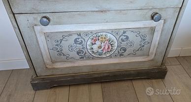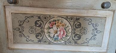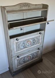 Bellissima scarpiera in legno massello decorata artigianalmente con tecniche antiche. Oggetto unico e raro che si abbina perfettamente con qualsiasi ambiente, classico o moderno. Dimensioni: 122x72x16 cm, Accoglie comodamente 9 paia di scarpe