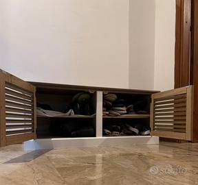 Vendo mobile basso in legno massello con ante a doghe, ideale come scarpiera o mobile da ingresso/soggiorno acquistato da Maisons du monde. Design caldo ed elegante, perfetto per case moderne, rustiche o stile nordico.