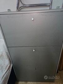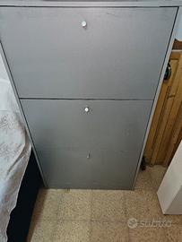 Vendesi scarpiera salvaspazio in legno a 3 ante appendibile anche a muro di altezza x larghezza x profondità 126x72x24 ciascuna anta con 2 ripiani interni di dimensioni per anta di altezza x larghezza x profondità 38x69x24, utile per cambio stagione o divisibile per componenti famiglia