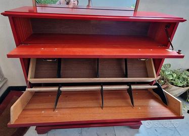 Scarpiera in ottime condizioni, in legno di colore "rosso vivo", di pregevole fattura, a tre ripiani:
