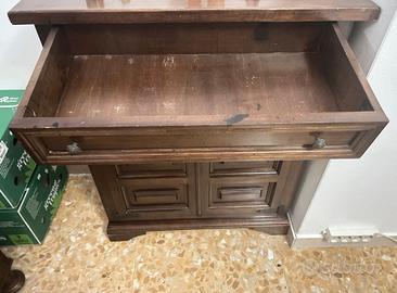Scarpiera In Legno Vintage, con un cassetto e tre ripiani. Con qualche macchia all’interno dei cassetti e ripiani; e qualche graffio sui piedi. Dimensioni: 38cm (profondità), 81cm (lunghezza) e 97cm (altezza).