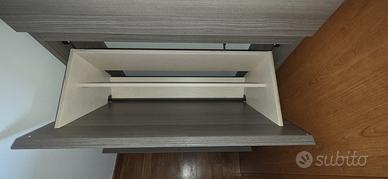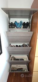 Marca :BIXER Modello : MINIMA Struttura : pannelli di truciolato di legno nobilitato /Laminato MDF Descrizione : Mobile porta-scarpe con maniglie a gola. 5 ante . Ripiano interno amovibile per alloggiamento scarpe di grandi dimensioni. Colore : Corda/Olmo Dimensioni totali ( in cm) : 90(L) x 25(p) x 212(h) Trasporto a carico del compratore. Zona Villaggio Dalmata/Cecchignola/Laurentina . 4° piano con ascensore .
