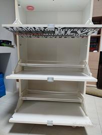 come da foto, scarpiera con 3 ante a ribalta, in ciascuna ribalta le scarpe possono essere messe su 2 file perché c'è un ripiano che divide, nessun problema di apertura o nelle cerniere, misure 118x70x29.