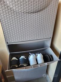 Disponibile ritiro a Roma o spedizione, Scarpiera modulare in plastica da esterno color tortora finitura Rattan, composta da 3 moduli impilabili. Ogni modulo può contenere al massimo 3 paia di scarpe.
