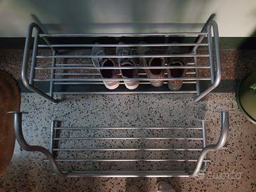 Set scarpiera più appendiabiti in ferro satinato color grigio. Misure scarpiera: larghezza 90 cm, profondità 35 cm, altezza 35 cm. Misure appendiabiti: larghezza 90 cm, profondità 35 cm, altezza 60 cm. Vendibili anche separatamente.