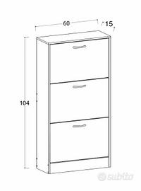 SCAPIERA A MURO ANTE - Pratica e resistente scarpiera in legno. La scarpiera a scomparsa unisce durabilità ed ergonomia, consentendo di riporre molte scarpe grazie alla profondità dei cassetti. Il porta scarpe è facile da pulire . • SCARPIERA DA INGRESSO O ESTERNO - La scarpiera si adatta ad ogni angolo di una casa moderna, risulta comoda in un ingresso o in terrazza, pratica e poco ingombrante dietro porte o dentro armadi. La scarpiera grazie agli scomparti, può contenere le scarpe per tutta la famiglia. Inoltre il ripiano superiore della scarpiera può essere utilizzato per riporvi oggetti decorativi o pratici. • MONTAGGIO - La scarpiera è gia montata se per alcuni agevola la si puo smontare. I pezzi saranno tutti numerati e facili da riconoscere. • MATERIALE - II porta scarpe è realizzato in legno e resistente melammina, trattato per essere facile da pulire e a non sciuparsi. Colore: ROVERE CHIARO Perfettametne integra, nessun graffio o rotture. Cambio per trasloco Scarpiera • Larghezza: 60cm • Altezza: 104cm • Profondità: 15cm • Materiale: pannelli di legno • Colore: effetto legno • 3 ante con maniglia RITIRO A MANO IN ZONA, SENZA COSTI oppure spedizione con costi aggiunti