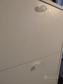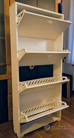 Vendo scarpiera in legno laminato, bianca, misure 148cm x 65 x 17,5 (altezza x larghezza x profondità), con quattro scomparti ognuno alto 35cm.