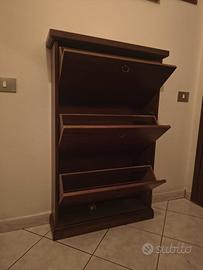 Scarpiera in legno con tre scomparti, ottime condizioni, priva di segni di usura, ante ben scorrevoli. Ogni scomparto ospita tre paia di scarpe. L 75,5 x H 118 x P 19,50. Ritiro a carico dell'acquirente