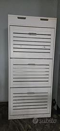 Vendo scarpiera bianca pratica e funzionale, ideale per tenere in ordine ingresso, camera o corridoio. 3 ripiani con doppio scomparto per ogni livello (ottima capienza) Vano superiore con apertura a ribalta, perfetto per gioielli, chiavi o piccoli oggetti Design compatto e salvaspazio 24 x 54 cm, altezza 120cm Colore bianco, facilmente abbinabile a qualsiasi arredamento. Buone condizioni generali, con normali segni di utilizzo (visibili in foto) Disponibile la consegna a domicilio