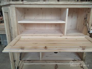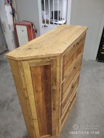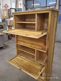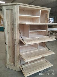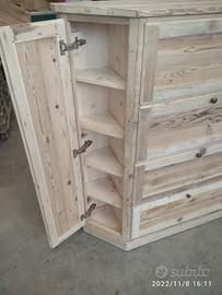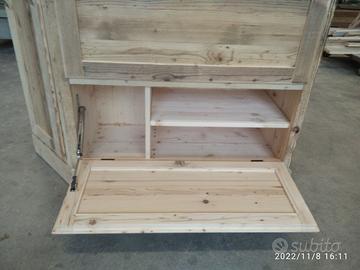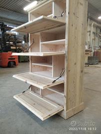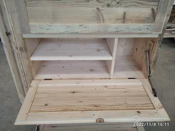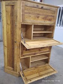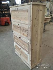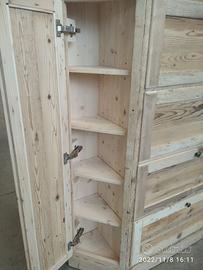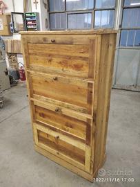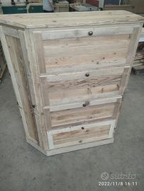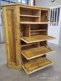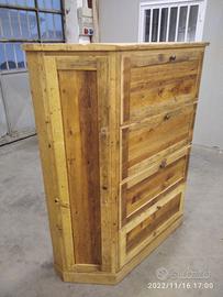 scarpiera spizzata costruita in abete vecchio recuperato spazzolato carteggiato in modo sia morbido al tatto con misura lungh.115 POSTERIORE 90 anteriore h 153 prof. 40 disposto in 4 vani da circa 20/24 cm di altezza intervallati con ripiani fisso e fianco verticale spostato in modo da tenere le scarpe piccole sui 2 ripiani e quelle alte al lato libero, cerniere in stile zancate e pistoncino per permettere la ribalta verso il basso. A lato nel fianco spizzato 4 ripiani aggiustabili in altezza, anta a telaio che si apre su cerniere regolabili ammortizzato con pomello. Schienale 14 mm in abete nuovo come interno mentre esterno in abete vecchio, frontali a telaio con pannello inserito posteriore. Sotto piedini incassati per mettere a bolla, con finitura effetto grezzo impermeabile in modo da isolare il mobile da acqua o altro. Iva non comprendente, costruito su commissione, non è disponibile a magazzino ma possiamo riprodurlo DIRETTAMENTE DAL PRODUTTORE ASTENERSI RIVENDITORI O COMMERCIANTI