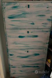 Vendo scarpiera di colore bianco e azzurro con quattro cassetti di cui l ultimo in fondo privo di gancetto, ma si può tranquillamente aprire manualmente spingendolo. Vendo per liberare spazio.