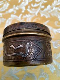 bellissima scatola antica di ottone con inserti in rame e altro metallo.