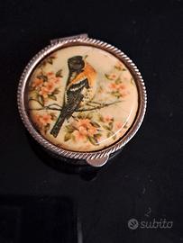 Antica Scatola di piccole dimensioni in argento lavorato con decorazione su smalto. Utilizzabile come Portagioie o altri oggetti di piccole dimensioni, come caramelle, pastiglie ecc. Prezzo da concordare