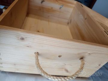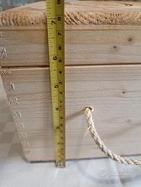 Bauletto o scatola tutta di legno, con cerniere frontali e due manici di corda laterali. Ottima da dipingere a proprio gusto, Misure in foto. Per altre info contattatemi