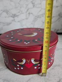 Scatola rotonda di latta natalizia color rosso, interno color oro con motivo passerotti. Misure in foto (Caramelle non comprese)