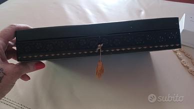 Scatola vintage in pelle senza piedini con chiave originale interno foderato in tessuto ocra