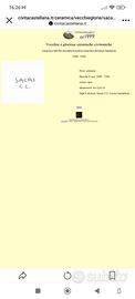Scatola ceramica con coperchio verde con sfumature dorate, bordino e pomo dorati. Marca Sacas Civita Castellana che ha terminato la produzione nel 1950. Misure: larghezza 19, altezza 14, peso 750 g.