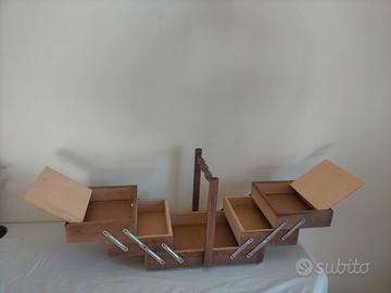 Splendido ed elegante cestino da cucito vintage in legno (periodo stimato anni '60/'70 circa)