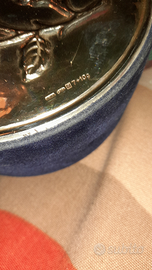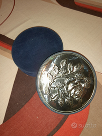 Vendo scatola ricoperta in velluto blu con una rosa in argento,almeno sembra, sul coperchio. C'è qualche difetto nello sbalzo .