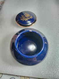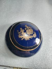 Si tratta di una classica scatolina portagioie (o tabacchiera) in porcellana blu cobalto, decorata con una scena galante in oro zecchino (nello stile di Limoges o Fragonard).