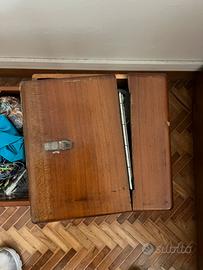 Scatola da cucito vintage in legno con apertura a fisarmonica – anni ‘60/‘70 Vendo elegante scatola da cucito vintage in legno, con apertura a fisarmonica su entrambi i lati e pratiche rotelle. Design tipico anni ‘60/‘70, perfetta sia come porta cucito che come complemento d’arredo. Struttura solida e stabile, con più scomparti interni ideali per organizzare fili, aghi e accessori. Condizioni buone, con normali segni del tempo. Solo uno dei due cassettini superiori ha la cerneira rotta come visbile in foto (questo non ne conpromette chiusura e apertura) Dimensioni circa: - altezza: 57 cm - lunghezza: 39 cm - profondità: 19 cm Ritiro a mano a Bologna centro
