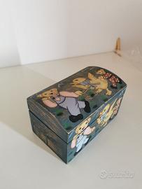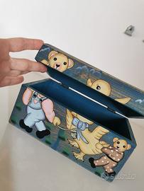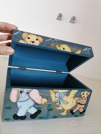 Bellissima scatola dei ricordi in legno, dipinta a mano in un elegante colore blu profondo (deep blue) e decorata con un allegro motivo animal.Ideale per custodire i ricordi più preziosi dell’infanzia: braccialetti nascita, prime scarpine, fotografie, piccoli oggetti e tesori speciali. Dimensioni: 20L X 12H x 12 D cm