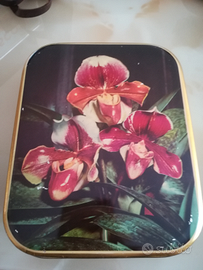 Vendo scatola di metallo vintage raffigurante un'orchidea. Conteneva originariamente caramelle Elah. Risalente anni 60. Misure 15x18x5. Ritiro in zona Famagosta ma consegne in altre zone di Milano possibile. Spedizione possibile. Se l'annuncio è on line l'articolo è disponibile.
