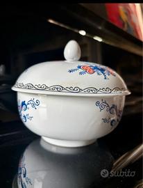 Scatola estee Lauder Imperial Cinnabar Porcelain collection. Può essere una scatola porta gioielli e porta cioccolatini. è dotata di un coperchio contenente un pomellino centrale. Bianca con decorazioni in blu e rosso orientale, un soprammobile del raffinato gusto orientale.