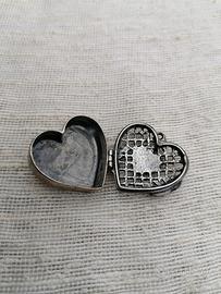 Scatola traforata in argento 925 prodotta dalla ditta Argentoblu' di Arezzo, a forma di cuore con decoro incastonato in pasta di vetro blu. Peso gr 13. Marchi ben visibili con scritta 925 e ARGENTOBLU