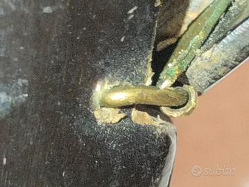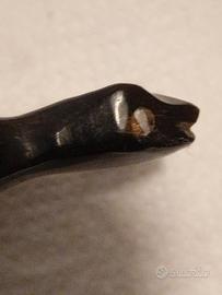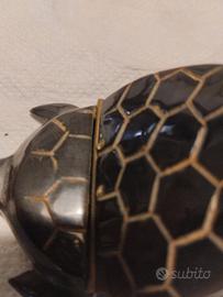rara tabaccheria in corno a forma di tartaruga occhi in argento, Europa xviii secolo, stato buono di conservazione. misura cm.9 x 5 x 2. spedizione gratuita.no ai perditempo. voglio precisare che tutti gli oggetti presentati sia con expertise. i prezzi non sono dati a caso, sono inerenti all'epoca e dallo stato conservativo e eventuali stime di docenti dell'arte. Campo Descrizione Epoca XVIII Secolo (Settecento) Tipologia Contenitore zoomorfo (scatolina/tabacchiera) Materiale Corno naturale (prob. bue o bufalo) intagliato e lucido Soggetto Tartaruga terrestre (simbolo di longevità e stabilità) Tecnica Intaglio manuale a sgorbia, incisione a bulino, lucidatura a caldo. Analisi dei Dettagli Costruttivi Corpo: Ricavato da un unico blocco di corno scuro. L'interno della vaschetta presenta i segni tipici della lavorazione manuale con scanalature irregolari prodotte da strumenti da taglio settecenteschi. Guscio (Coperchio): Decorato con un motivo esagonale inciso che imita il carapace reale. Le incisioni rivelano lo strato interno del corno, di tonalità più chiara, creando un effetto bicromatico naturale. Cerniera: Perno passante in lega bronzea/ottone, ribattuto artigianalmente. L'assenza di viti e la presenza di ossidazione naturale del metallo confermano la produzione pre-industriale. Base: Fondo liscio con lievi irregolarità e segni di usura coerenti con l'appoggio su superfici rigide nel corso di tre secoli. Stato di Conservazione Ottimo. Il materiale non presenta crepe strutturali o segni di attacco xilofago (insetti). La cerniera è ancora saldamente ancorata alla struttura in corno, segno di un'eccellente qualità del materiale organico utilizzato. Note Storiche Oggetti simili erano molto diffusi nelle biblioteche nobiliari e nei "cabinets de curiosités". La tartaruga, oltre a essere un oggetto decorativo, veniva spesso utilizzata per contenere il tabacco da fiuto o piccoli strumenti per la scrittura (come sigilli o ceralacca).
