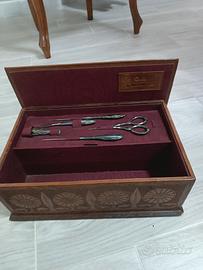 scatola in cuoio intarsiato G: M datata 29maggio 1924 per cucito. Rivestito internamente intermanente con tessuto originale